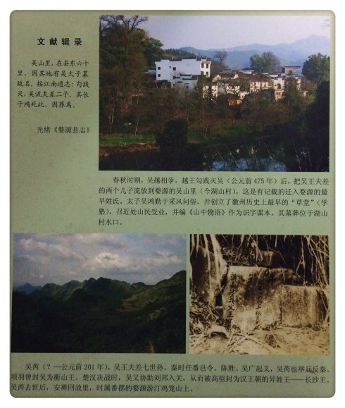 乡人不知吴太子(鸿),两过江湾亦无缘;博物馆里三二句,几经百度才知处——吴王夫差的二位王子,流落在婺源江湾镇湖山村。西面是朱熹故里紫阳(紫色东来,艳阳高照)镇,江主席祖籍在江湾。