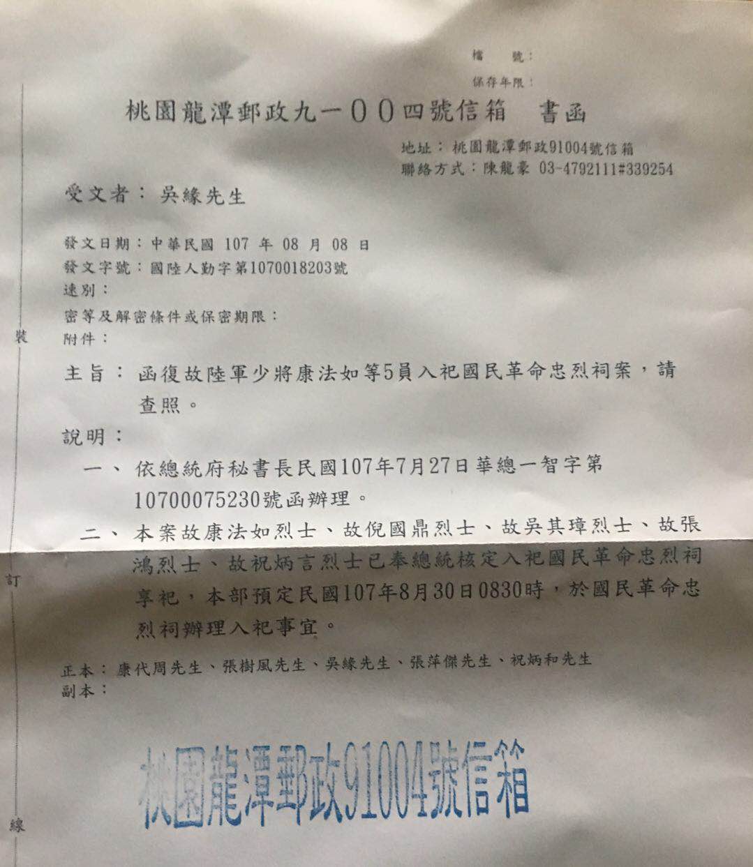 浙江杭州宗亲吴缘宗长的四伯父、中国远征军烈士吴其璋宗长,经中华民共国总统府核准,将于本月30日上午8:30分,入祀国民革命军忠烈祠。