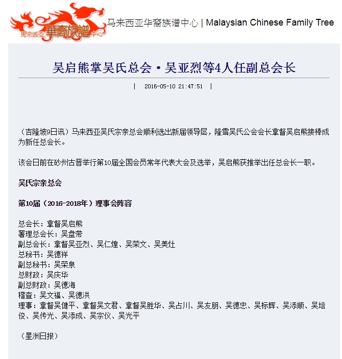 马来西亚《星洲日报》2016年5月9日吉隆坡讯:吴启熊掌吴氏总会·吴亚烈等4人任副总会长