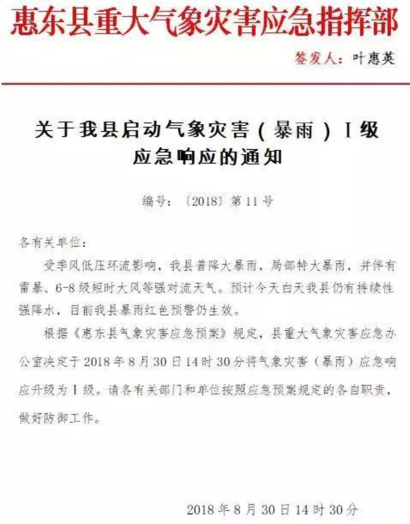 8月27日,广东惠州惠东县普降大暴雨,局部地区特大暴雨,暴雨持续四天,郊区有些地方出现山体滑坡,城区有些路段严重积水,交通中断,受强降雨影响,白盆珠水库水位持续上涨,当时的水位已达76.92米,超过了76米汛限水位。8月31日,为确保水库安全,根据惠州市三防指挥部《关于开闸泄洪的令》(惠防令[2018]1号),定于8月31日上午8时40分开闸泄洪,下泄流量不超过300立方米/秒。白盆珠水库位于惠东白花镇四十多公里处的西枝江上游。泄洪12个小时后,白盆珠水库泄洪的洪水到达白花镇。