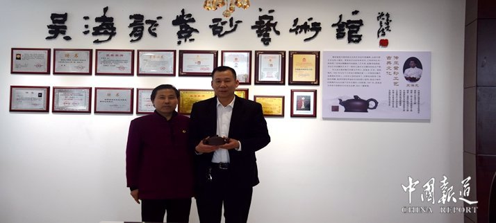一件好的紫砂壶,远远不是几个简单的步骤就能做出来的,这需要匠人的功力,还有细细打磨的耐心、用心。记者们注意到吴海龙粗糙的手掌,那是常年与泥土打交道留下的印记。8岁时,吴海龙就用课余时间捣鼓起了紫砂,做出来的紫砂花盆成为集市上的“抢手货”。15岁初中毕业那年,他便跟随父亲学艺,反复练习打泥条,直到泥条的厚薄、平整度完全一致。枯燥、繁重的工作使他懂得紫砂工艺必须追求一丝不苟,更明白臻品宝壶锻造之不易。他表示,所有打上吴海龙商标和吴氏金鼎标记的壶,从泥料开始到烧制成型,他都会全程跟踪,看好把握好每一个环节,保证所有的货出来都是精品。在整个流程中,如若发现有不合格的壶,会直接把它销毁,以防流入市场中。