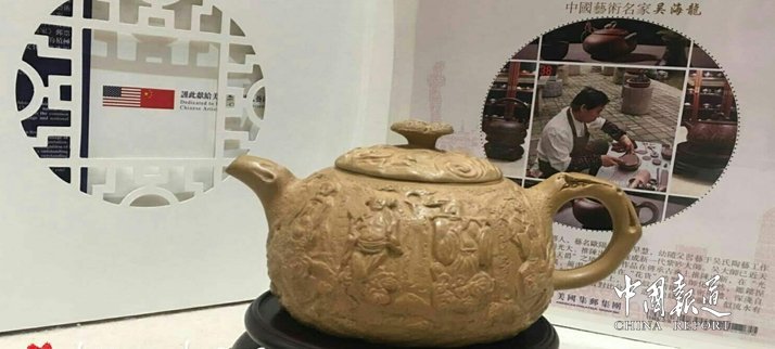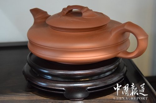 中国报道讯(吴蜀丰 江苏报道)日前,在江苏省常熟市东方红木家俱艺术馆出席 “千秋文脉传盛世”改革开放40周年中国苏作红木文化展新闻发布会的媒体,对陈列于东方红木家具艺术馆的各种紫砂壶产生了浓厚的兴趣。壶的主人国家一级工艺美术大师吴海龙趁此机会,向到会媒体朋友“科普”紫砂壶知识。