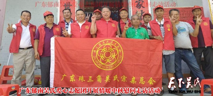 2018年9月14日早上8.30,广东郁南吴氏爱心志愿团在吴铁汉、吴木彬的带领下,从连滩出发上高速,宝珠下高速后同都城和北部片的吴氏兄弟姐妹们在加油站处集合。一同前往車滘举行慰问活动,午餐后,于下午又前往地心,东二石龙坑口,东二凤雁等地慰问,为66户贫困吴氏宗亲及及吴氏老人送上月饼、花生油、方便面、红包等慰问品,受到当地吴氏宗亲的好评。