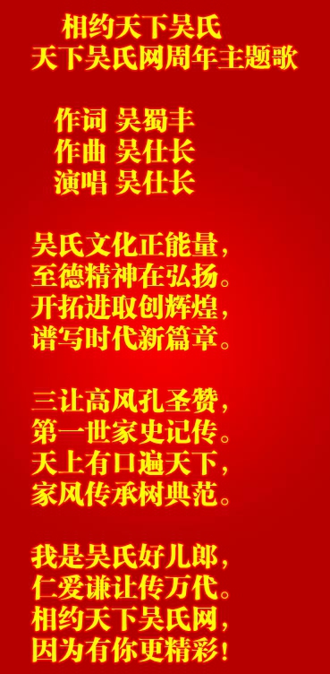 我是吴氏好儿郎,仁爱谦让传万代。相约天下吴氏网,因为有你更精彩!