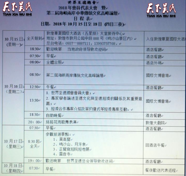 第一阶段(上午):第二届海峡两岸传统文化高峰论坛内容: 大会前全体代表合影。 主持人:雷波 欢迎来自世界各地的代表,对各位领导、代表的到来表示热烈的欢迎,并致以亲切的问侯! 宣布大会开始。 全体起立,向中华民族共同始祖黄帝、炎帝,向至德文化创立者泰伯公行三鞠躬礼! 升国旗,奏唱国歌。 奏唱至德歌。 介绍出席大会的主要领导、嘉宾,对各位领导、嘉宾的出席表示衷心的感谢! 本次大会得到甘肃省国家台湾事务办公室的支持,甘肃省台湾事务办公室、省委统战部批准同意,敦煌市政府领导的高度重视,得到敦煌正觉写经院、甘肃省旭东书画研究院、甘肃省老子文化旅游有限公司等单位赞助支持,我代表大会组委会和全体与会代表对你们的支持帮助表示衷心的感谢! 下面进入大会议程: 一、世界至德总会董事局主席吴希民博士致欢迎词; 二、甘肃省、敦煌市领导讲话(致欢迎词); 三、中国国民党副主席.代理主席,中国国民党中央评议委员会主席团主席 林政则先生讲话; 四、世界至德总会荣誉主席、中国东盟10+1商务理事会理事长许宁宁作《中美贸易战与台海两岸情况》; 五、吕明晰 世界至德总会常务副主席、中华炎黄文化研究会文明传承联合会理事长、北京孝行天下文化传播中心主任,主讲:(请吕明晰老师定题目); 六、中国社科院哲学研究所原所长 吴尚民 《中美贸易战与台海问题》; 七、安徽省党委参事室主任 周庆《构建人类命运共同体与海峡两岸的和平统一》; 八、世界至德总会高级顾问、清华大学博士后、华南师范大学副教授 吴晓懿《书画传家瑧于善——海峡两岸至德书画家文化交流研究》; 九、美洲华人代表、美国至德三德总公所主席 吴志仁发言; 十、欧洲华人代表、西班牙侨领 蔡永廉发言; 十一、澳洲华人代表 黄 壮发言; 十二、非洲华人代表、阿尔及利亚侨领 吴泽波发言; 十三、大洋洲华人代表、多米尼加侨领 蔡裕添发言; 十四、台湾代表 陈先生发言; 十五、台湾一国两制研究协会会长 蔡武璋发言; 十六、亚洲华人代表、新加坡国际著名文化学者、表演艺术家、教育家、《中华正气会》创会会长、《中华正气大讲堂》创始人 郝知本教授 演讲:《海峡两岸同胞、全球70亿同胞团结起来!保护地球母亲!维护世界和平!》。 十七、宣读大会“进一步推动海峡两岸和平统一敦煌宣言”。 第二阶段(下午):世界至德会员大会内容: 一、吴荣华第一副主席报告至德总会一年来工作情况; 二、黄慧和秘书会务报告:(列具体内容) 三、通过事项: 1、通过秘书报告内容; 2、通过世界至德总会关于进一步发展至德经济、促进至德文明的决定(另附)。 3、通过世界至德总会等单位联合发起,关于文化引领,推动交流,促进两岸和平统一的决定(另附)。 4、公布人事任命: 通过各地组织部门推荐,经总会组织工作委员会审查,总会常委会研究同意,本次大会公布: 吴 勇 任世界至德总会董事局副主席; 李海波 任世界至德总会董事局副主席; 吴淑珍(女)任世界至德总会董事局常务会董; 蒲垣君 任世界至德总会董事局常务会董; 贾 瑾(女)任世界至德总会董事局会董; 王恩娟(女)任世界至德总会董事局常务会董; 艾才华 任世界至德总会董事局常务会董; 高 斌 任世界至德总会董事局常务会董; 袁友均 任世界至德总会董事局常务会董; 方炳年 任世界至德总会董事局常务会董; 吴清奇 任世界至德总会董事局会董; …… 四、专家学者论述至德文化与至德经济的关系及其重要意义; 1、许宁宁(东盟10+1中方理事长,世界至德总会荣誉主席)主讲:世界至德与一带一路; 2、吴明日常务会董演讲:至德文化推动至德经济发展,促进至德文明的积极意义; 3、王淑萍常务副主席演讲:至德文化的发展对增强国家软实力的促进作用; 4、蔡进常委演讲:至德现代农业产业联盟发展的现状及下步发展战略; 5、周锐敬副主席发言:至德大健康产业的构筑,对至德家人的健康及社会的积极作用; 6、吴进枝常委演讲:至德旅游产业联盟是国家旅游板块不可缺的重要组成部分。 五、经济合作项目介绍及签约仪式等经济项目互动: 1、加入世界至德农业产业联盟签约; 2、加入世界至德国际贸易产业联盟签约; 3、加入世界至德网络信息传媒产业联盟签约; 4、加入世界至德旅游酒店餐饮产业联盟签约; 5、加入世界至德健康产业联盟签约; 6、经贸合作促进会与各产业联盟签约; …… (配套项目资料发放) |