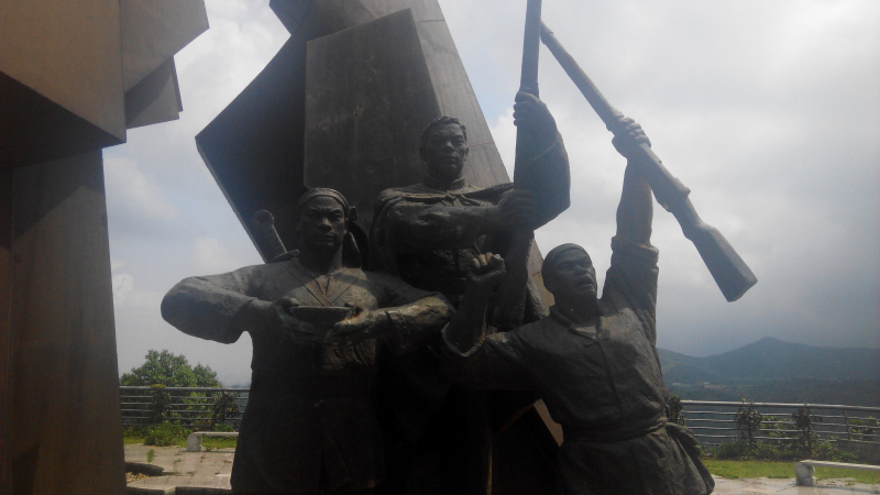 从“第一枪”这里往上还有路,不过我觉得这上面应该没有雕塑了,因为这第一枪,应该是在雕塑园的最高处才是,所以就继续向前走,看到的是“练兵试枪”的群雕,不过我注意到这个雕塑里,起义军士兵头上没留辫子,不知道是不是在清朝的时候,客家人不留辫子,还是参加起义后,起义军就剪了辫子。再往前走是运送枪支弹药等军火的雕塑。三洲田这里离海边(也就是现在深圳的大小梅沙)只有十里,很近,所以孙中山选择在这里起义,从海路运军火进来很方便。