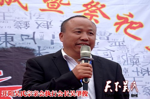 东南亚至德筹备会、贵州吴氏宗亲总会会长吴学强,开阳吴氏分会,六盘水市吴氏分会,毕节吴氏分会、都匀吴氏分会江苏无锡吴氏祖地鸿山镇及冯三镇政府及当地村委有关负责人先后上台先言并对吴氏宗祠的落成峻工表示热烈祝贺!云南吴氏组织代表团参加,以会长吴俊为团长,常务副会长、秘书长、副会长、常务理事为代表的代表团有,吴有龙、吴建根、吴三祥、吴瑛、吴士泽、吴加添、吴开早、吴金胜等代表。