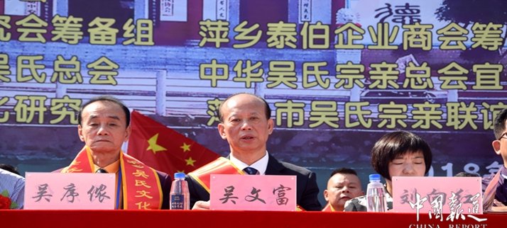 由中华吴氏宗亲总会秘书长吴谨程主持本次盛会,大会开始全体起立,奏中华人民共和国国歌,奏中华吴氏会歌及鸣炮,分别介绍了出席本次大会的领导和贵宾及主席台就座,中华吴氏宗亲总会分別向萍乡吴文化研究会授牌,赣西泰伯吴文化研究会向萍乡分会授牌,萍乡吴文化研究会、萍乡泰伯企业商会会长吴勇致欢迎词,芦溪县政协副主席、县工商联主席刘向红致贺辞并介芦溪县基本情况,海峡吴氏总会会长吴剑锋,中国光彩事业基金会,台湾两岸实业有限公司董事局主席,厦门市泉州商会高级顾问,《天下吴氏》网高级顾问,铂之爵主持学院荣誉院长吴序侬等代表先后致辞发言。