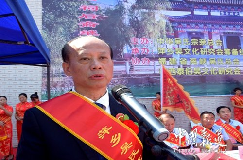 中华吴氏宗亲总会主席吴文富发表热情洋致辞,吴文富在辞中说,在欢度中秋、国庆“双节”的喜庆日子里,我们相聚在“全国最美县域”芦溪县,召开中华吴氏第十一届恳亲大会暨海峡两岸经贸论坛;值此美好时刻,我谨代表主办单位——中华吴氏宗亲总会及泉州吴氏大宗祠管委会、晋江市吴文化研究会,向出席本次大会的各位领导、各界朋友们表示热烈的欢迎和衷心和感谢!向本次大会的承办单位——中华吴氏宗亲总会萍乡分会、萍乡泰伯企业商会全体宗亲致以亲切的问候!
