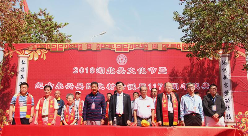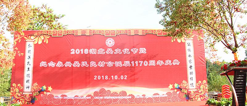 2018年10月2日上午,由湖北省吴氏至德文化发展有限公司主办、阳新吴氏至德文化发展有限公司承办的“2018年湖北吴文化节暨永兴吴氏始祖良材公诞辰1170周年庆典”活动在阳新县万春公园内隆重举行。