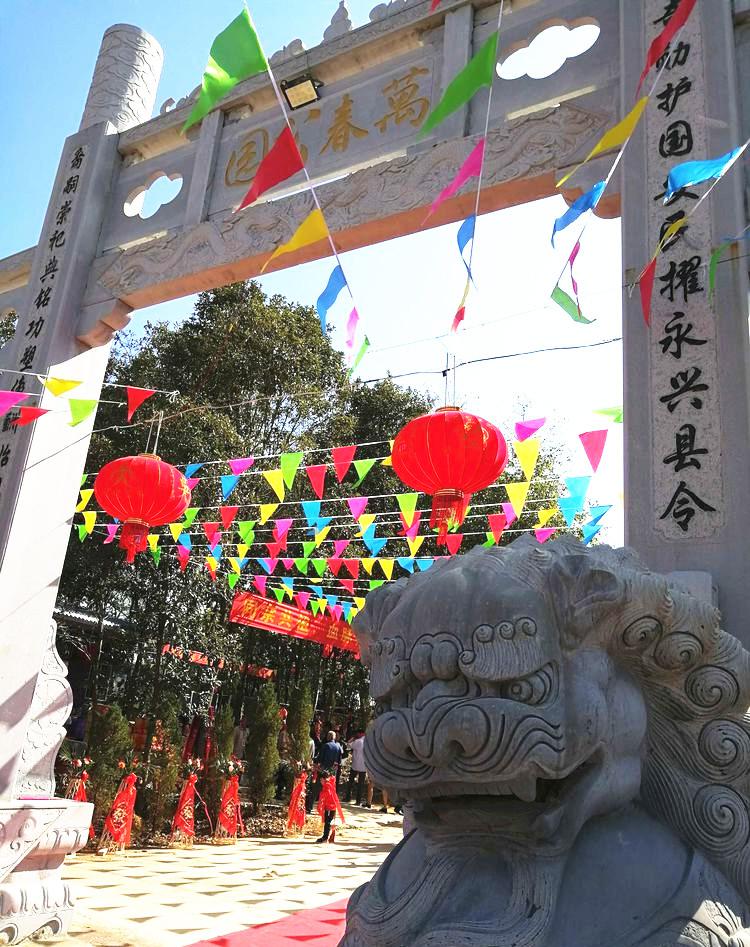 11时30分,与会的吴氏宗亲3000余人怀着崇敬的心情列队前往良材公墓园,只见一座高大的花岗岩石牌坊巍然屹立,牌坊正中上书四个金色大字“万春公园”,石柱左右篆刻了一副楹联,上联是“良材建奇勋护国安民擢永兴县令” ,下联是“裔嗣崇祀典铭功塑像酬始祖遗恩”。青松高耸,绿树掩映,永兴始祖良材公和夫人上官氏的墓冢悄然静卧。瞻仰先祖的墓冢和塑像,一种尊祖敬宗之心不禁令人油然而生。