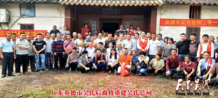 天下吴氏讯(特约撰稿吴文彬)金秋十月,硕果累累,在普天同庆国庆的大好日子里,江西萍乡迎来了中华吴氏第十一届恳亲大会的成功举办,今天我们广东英德吴氏宗亲在英德市吴氏总祠70年后又重聚。七十年前的英德吴氏总祠辉煌气派雄伟,但由于历史时代的变迁遭遇了破坏,现在只剩下了三面墙,吴氏后裔见者无不感到痛心。