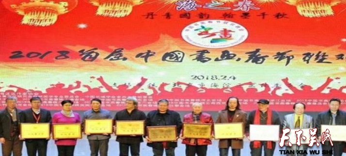 2018年2月4日参加北京首届书法春晚,现场奉献墨宝《家和万事兴》悬空书法真功夫,以汉简隶多种书法于一体,技压群芳荣获2018中国首届书法春晚十大书法家金奖!