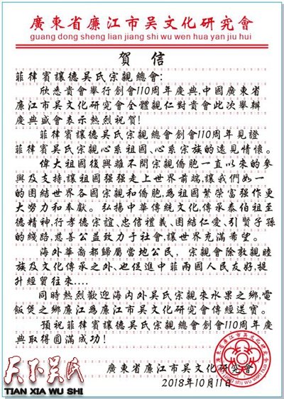 辽宁吴氏企业经济文促会致菲律宾吴氏总会贺电