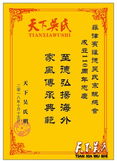 天下吴氏网致菲律宾让德吴氏总会110周年贺电