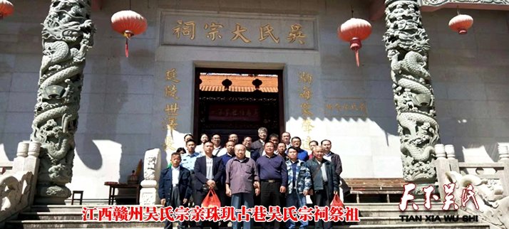 天下吴氏讯(特约采编 吴述东 )悠悠珠玑行 难忘宗亲情 2018年10月28日,秋高气爽,阳光灿烂。来自江西省赣州市章贡区、赣县区、蓉江新区、南康、大余、信丰、龙南等地的二十多位吴氏宗亲,怀着对先祖泰伯公的无限追思,在南雄吴氏宗亲联谊会副会长在良宗亲和慎庭公后裔述光的引荐下,慕名来到了具有悠久历史的珠玑古巷,参观了吴氏大宗祠。