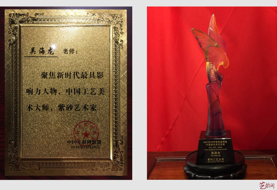 吴海龙大师紫砂艺术作品虽吴大师名扬远播,但他不为俗界声名所累,在自己的艺术馆精尽艺业,把人生、艺术、紫砂揉捏一体。虽他的作品在市场上一壶难求,但他禀着"良工不示人以璞",静心做匠人,精心做艺术,淡泊名利,踏踏实实地秉承着自己:“一生只做一件事,一事只怀一颗心”的理念,沉迷于紫砂艺术的钻研和制作中。艺术年鉴:1972年,随父研究创作紫砂陶艺;1992年,获轻工部中国工艺美术协会颁发的“陶瓷美术设计奖”1997年,创办吴氏陶艺吴海龙紫砂艺术馆;2001年,加入中国工艺美术学会;2002年,创作的《春意》作品荣获中国工艺美术百花奖金奖2003年,纪念毛主席诞辰110周年获特别贡献奖2006年,创作的《竹韵》作品荣获中国工艺美术百花奖金奖2008年,加入江苏陶艺紫砂协会2009年,《寿桃壶》在第六届中国国际茶业博览会精品茗壶评选中荣获金奖2010年,《四方荣天》作品荣获第八届中国工艺美术博览会“中艺杯”金奖2011年,《秦权壶》在河南第三届紫砂艺术节参赛作品评比中,经河南省工艺美术行业协会、河南第三届紫砂艺术品博览会组委会评审荣获一等奖2012年,《小竹扁壶》作品在江苏省陶瓷行业协会陶艺作品创新评比活动中被评为一等奖2012年,被评为(第六届)中国工艺美术大师2013年,入选《百年无锡名人图谱》2013年,《石瓢壶》在中国宜兴陶艺五朵金花上海展中,经严格评审荣获金奖2013年,《名家》杂志报道2013年,受邀并出任中国国际交流促进会理事;2013年,荣获教育部中国人生科学学会?全国审美教育与文化产业合作组织授予的中国紫砂壶设计大师称号;2014年,受聘为湖北省荆门市紫砂协会顾问;2014年,经中华人民共和国美术师评审委员会审查通过国家一级美术师任职之资格;2014年,其仿古壶、六方壶、榴香壶作品在首届世界华人艺术家书画作品邀请展荣获金奖;2014年,受聘为中国无锡书法艺专校友会北京总会艺术家联盟专家组成员;2015年,获“中华民族伟大复兴杰出贡献人物”、“中华民族杰出艺术家”、“中国国际现代艺术研究中心终生艺术顾问。作品收录纪念抗战胜利70周年主题《中国邮册》。2016年,入选《中华人民共和国年鉴》入选者(2016卷);2016年,被聘为求是文化中心艺术品鉴定与评估委员会会员;2016年,《仿古壶》被中国农业博物馆收藏。2016年,《彩蝶壶》被人民大会堂收藏;2016年,经国礼特供艺术委员会和国礼文化市场委员会评审授予《中国国礼特供艺术家》称号和《国礼特供证书》。2016年,泰国亲王素博·巴莫、泰国公主巴莫·优雅、公主巴莫·雅娅等泰国皇室造访吴海龙紫砂艺术馆,进行了为期两天的参观考察。2016年,《石扁壶》作品被中南海艺术馆收藏;2016年,光明网、人民网、中国网、半月谈、新华访谈网、央视报道、中国报道、中国国际新闻网、中国文物网、中国艺星网、中新网、中国国礼官方网站、人民艺术收藏网、中华城市网、环球聚焦传媒网、国际凤凰网、天天快报、今日头条、国都智库、墨宝收藏、艺韵百科、百度、腾讯、优酷、搜狐、人民微视频、爱奇艺、土豆视频、华人频道、常熟电视台、江苏卫视、江苏国际频道等媒体纷纷对其报道2016年,被评审为国家工艺美术大师;2017年,被台湾海峡两岸文化经贸科技观光发展协会特聘为驻江苏省两岸文化交流会长。2017年,被文化部东方华夏文化遗产保护中心中国文化遗产保护研究院评为“紫砂设计与制作”类型传承人。2017年,其作品入选哈萨克斯坦世博会。2017年,中国诚行品牌万里行,被评为“诚信紫砂艺术家”。2017年,被聘为江苏省收藏家协会紫砂委员会副秘书长。2018年,应邀参加全国人大会议中心举办的中国国际经济合作论坛。2018年,《黄河之声》主办吴海龙大师紫砂论坛研讨会。2018年,受邀参加“榜样春晚”荣获榜样艺术家称号。2018年,9月15号紫砂作品受邀亮相中国政协文史馆。2018年,10月2号出版发行《中华英才》书刊《石扁壶》作品被中南海艺术馆收藏。
