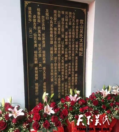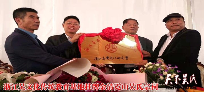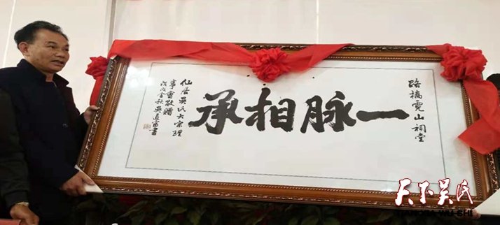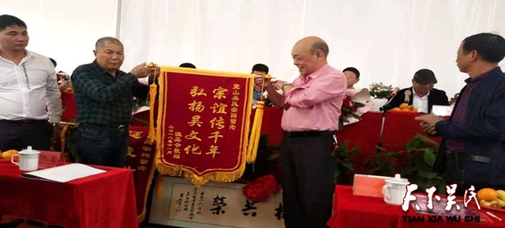吴继初会长介绍了宗祠的发展及文化的历史渊源,讲述了伟大的历史人物和祠堂的悠久历史,想通过这种方式来教育下一代把这些优良传统代代传承下去,发扬光大。吴道富会长与吴肿照部长一起向霓山宗祠代表吴度云和吴庆文授牌,一块金光闪闪的吴文化传统教育基地的牌匾从此就要在这里生根发芽,它象征着中华传统文化,时刻警醒我们怎样弘扬正能量,如何教育下一代沿着祖辈的文化足迹,把传统文化撒向神州大地。吴金松会长就吴文化的发展历程,作了精彩绝伦的演讲,会场不时传来雷鸣般的掌声。
