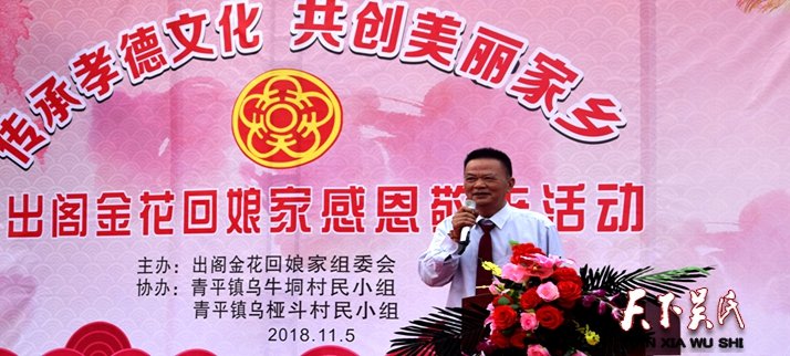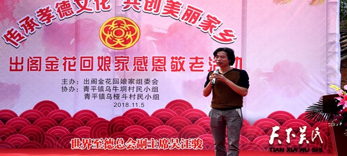 世界至德总会主席吴希民博士,世界至德总会常务副主席曹加敏,世界至德总会副主席吴汪骏,世界至德总会常务委员会副主席吴和平,吴希华,世界至德总会副主席 、廉江市吴文化研究会常务会长吴玉文,青平镇乌牛垌村村长吴平安等吴氏宗亲代表参加并先后祝贺致辞,乌牛垌村出阁金花代表吴强英,乌桠斗村出阁金花代表吴慧玲,宗贤代表吴聪,吴太新上台发言。吴爱英最后对活动总结发言。