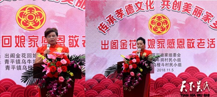 出阁金花代表吴强英在会上表示,父母把我们抚养成人,虽然我们成家立业,我们也在生儿育女,正所谓,当家才知盐米贵,养子才报父母恩。以忠孝为立身之本,常回家看看将是我们做儿女的永恒主题。
