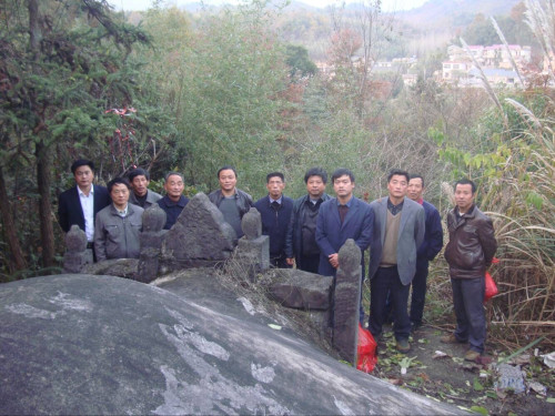 下午,吴立仁、利贤兄弟安排专车带我们前往他们的先祖墓地。中途,立仁的父亲吴建民宗长在路边等候,亲切握手介绍之后,一同前往晏家屋吴氏祖茔拜谒。在一处名为“天鹅孵蛋”的青山脚下,绿竹掩映处,悄然安卧着一座古墓。大家急切地走上前去,只见石碑上赫然刻着“祖妣吴母王氏老夫人及显考吴公宣福老大人合墓”这正是罗湾祥庶公之妻王氏及子宣福的安息之所,特别让人惊喜的是上面还刻有:“老籍太湖东乡吴家樟树”,吴家樟树正是罗湾的旧称,此碑立有近百年,宁国先祖真是不忘故乡,煞费苦心,告诉宁国子孙勿忘祖地罗湾。