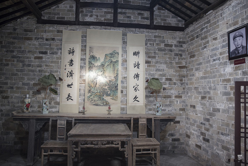 吴氏旧居的客厅,一幅山水中堂画,配了对“畊读传家久,诗书济世长”的对联,“畊”同“耕”,很有文化内涵和家训的意味。
