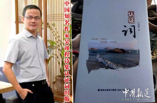 中国报道讯(吴蜀丰福建晋江报道)日前,晋江诗人吴谨程的诗歌作品集《认证词》由海峡文艺出版社出版。这部作品集从诗人近几年创作的数百首诗歌作品中选编150首,以“认证词”命名,诗人、诗评家卢辉、蔡芳本、晓川为之撰评,石狮日报茅罗平总编为之掌镜。