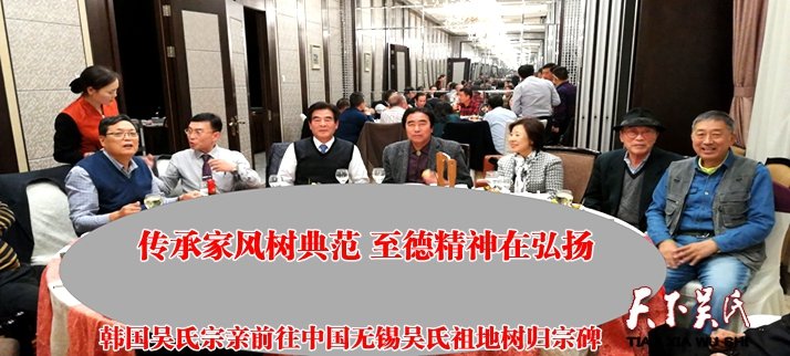 、吴贞心、吴在天、吴相祚、吴中荣、吴赞善、吴圣休、吴钟南、吴锡晚等吴氏宗亲专程前往中国江苏无锡吴氏祖地泰伯陵树归宗碑,碑文上落款的名字有总裁吴南烈、首席副总裁吴谱泳,各贯派大宗会长:吴润弼(高敞)、吴世庸(海州)吴泳食(同福)、吴