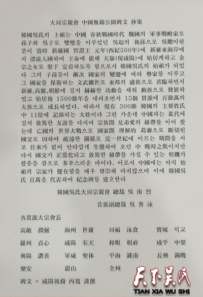 天下吴氏网讯(吴乐-)常言道,树高千丈落叶归根,为传承家风,弘扬至德精神,日前,来自大韩民国的数十名吴氏宗亲在总裁吴南烈的带领下分别代表韩国吴氏大同宗会各分会的领导吴润弼、吴世庸、吴泳食、吴、吴贞心、吴在天、吴相祚、吴中荣、吴赞善、吴圣休、吴钟南、吴锡晚等吴氏宗亲专程前往中国江苏无锡吴氏祖地泰伯陵树归宗碑,碑文上落款的名字有总裁吴南烈、首席副总裁吴谱泳,各贯派大宗会长:吴润弼(高敞)、吴世庸(海州)吴泳食(同福)、吴(宝城)、吴贞心(罗州)、吴在天(咸阳)、吴相祚(和顺)、吴中荣(咸平)、吴赞善(兴阳)、吴圣休(军威)、吴钟南(平海)、吴锡晚(长兴)、还有乐安、蔚山、全州等地的吴氏宗亲,碑文由咸阳后裔吴丙宽撰写。