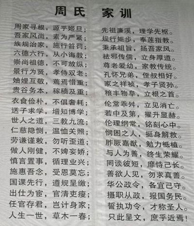 重庆市永川区邓家坳周氏(尚书公后裔)字辈:尚梦应康世,孙宗道仕友,子均仲忠万,以自时大章,华先维继述,裕后乐英贤。秩序本天定,彝伦在人全,谟烈由今绍,奕叶谱相传,家乘恪遵守,祥发永绵延。重庆市万州区(四川彭州回民后裔)周氏字辈:文天国应全,忠孝乃成先,卓善(尚)方为宝,事业乐康年。广东普邑周氏字辈:开基宏远猷,笃庆光前悠,孝友承先德,萃宗衍范畴,合家宜睦顺,守理重经修,奕世永绳武,千秋恒作裘。广东河源周氏字辈:汝南昭穆序,作述发其祥,奕世声名焕,传家福庆长,恩明联统纪,谊美植纲常,允克绍先烈,万年迪吉康。广东潮阳泗水周氏字辈:多士敬宏毓,英资衍芳绪,勤修昭厚德,翊赞耀明良,攸子崇伯钦,淑宪绍懿徽,植本宗永健,嗣典运开祥。
