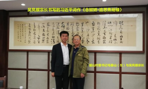 深圳阳明荣公司董事长吴长阳宗长委派著名书法家吴凤银宗长挥毫书写了习近平总书记1990年的词作《念奴娇·追思焦裕禄》,赠送给韶山村党委。韶山村党委成员将吴凤银宗长的书法作品带回韶山,裱装之后,挂在了韶山党委的会议室中。