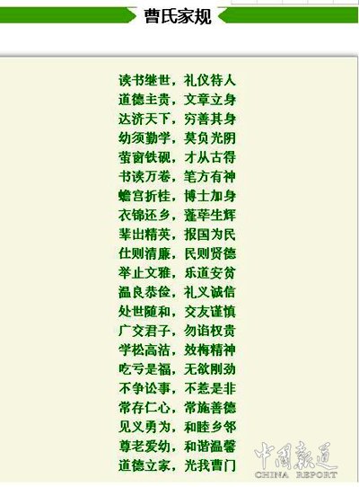 曹姓宗卷 曹姓的字行辈份除排列有序井然外,还体现着报国忠贞,勤俭治学的家规家训。如曹振甲所修《曹氏家谱》中江苏曹姓一支字行为:“春贤泽绶衡,善禄道耀勋。”湖南省南岳衡山曹启宗后人字辈:第四至十九代字辈:承廷光文,德仲仕子,仁世大通,淑贤元子。第二十八代起字辈:懋学徵绍虔,家良致述先,希时华邦庆,景登允尚传,积善贻芳远,培基树泽长,业修斯富有,本立定荣昌。湖南省郴州市宜章县赤石乡上塘背字辈:朝万叟知 受孟惟思 钧尚大仕 仁子任嗣 文经兼武纬翊 祖德源 诗书钊勤 家富益廉 真杰义善 登高超新。湖南芷江曹氏字辈:“之子言文与齐思庭世昭光继恕承先代法可得久长安邦定治平福享久成荣正大鸿运兴万家庆天恩”。湖南常宁曹氏字辈:“子应荣达 继必贤良 诗兴泽后 孝启家祥 芳连甲第 声振朝堂 光余先祖 百世其昌”。1994年新续字辈:“仰承洪范怡和泰康敦崇礼义德业昭章福禄绵远晖耀平阳”。湖南芷江曹氏字辈:“文大致启宗国学万世兴家传日新胜吉庆中长应”。湖南凤凰曹氏字辈:“长延祖宗宏绪达启世代仁义忠厚贤良俊秀尚德景星庆云”。民国三十二年曹时药《六修曹氏支谱》,湖南益阳曹姓一支字行为:玉受秀贤彦,必钦子冠锡,良文教尔廷,家盛英嗣起,时安德泽芳,显承师俊业,圣哲立名郅,仁孝怀三代。