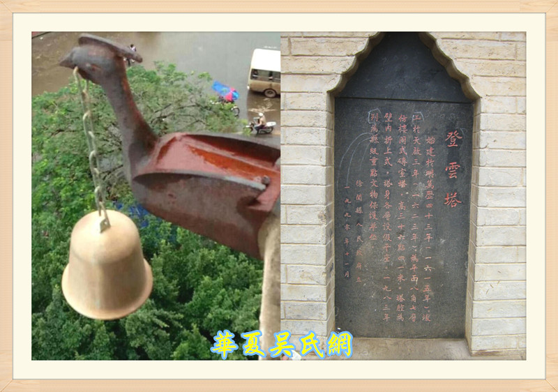 注:登云塔位于徐城镇民主路与东方路“丁字”相交处。明万历四十三年(1615年)破土奠基,天启三年(1623年)竣工落成。塔体为八角棱台形,叠七层,每层有内室。体积自下而上逐层递减,底层内室直径3.35米,顶层内室直径1.24米,全塔高36.41米,踏跺(石阶)设在夹墙中,盘旋而登190级可至塔顶,塔身砖石泥灰沙结构,以砖为主,砌法一顺一丁,每层均有线砖和牙相间装饰,坚固美观,经360多年,至今古塔风貌依然。