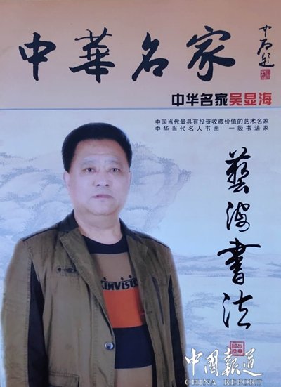 吴显海,1958年2月出生,山东青岛人,现为山东平度市书法协会会员,中国国家书画院胶东分院副院长,中国书画家协会会员。中国书画职称润格评定中心评定为一级书法师,作品润格:国内市场价每平方尺为5000——8000元人民币,国际市场价每平方尺为1000——1500美元。自幼酷爱书画艺术,基于书圣王羲之墨贴,深入研磨,广收博取,艺术感悟纯朴,自然情感表现淋漓,艺术感染力强,书法形成热烈奔放,秀润霸气,意奇而深,形成了独特风格,深受百姓欢迎的艺术家。诸多作品已被国家专业机构及国际友人收藏。