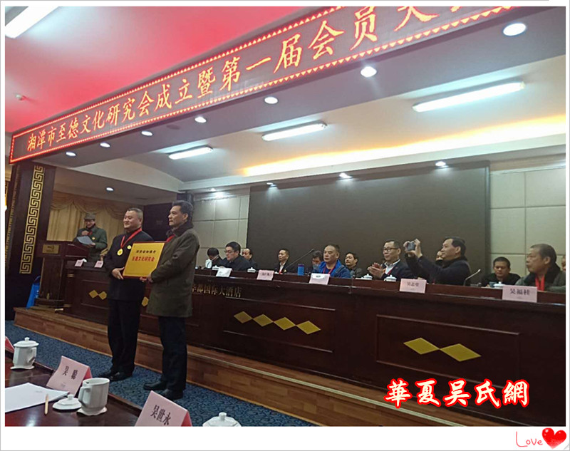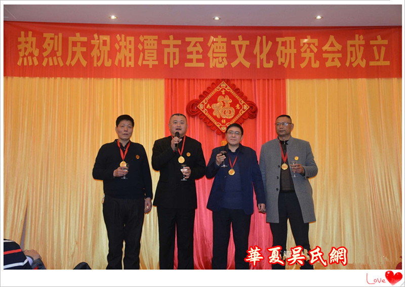 会上,主持人吴增魁介绍来宾之后,奏唱国歌,然后湖南省湘潭市企事业文联副主席、秘书长陈永仁宣布批准文件并授牌,湖南至德文化委员会常务委员、企业家吴洪杰被任命为湘潭市至德文化研究会首届会长。各地代表纷纷致辞祝贺,气氛热烈。与会嘉宾赠送了大量的书画和纪念礼品,与会者均获得了一件珍贵的吴升平至德梅花剪纸和一枚精美的成立会纪念章。