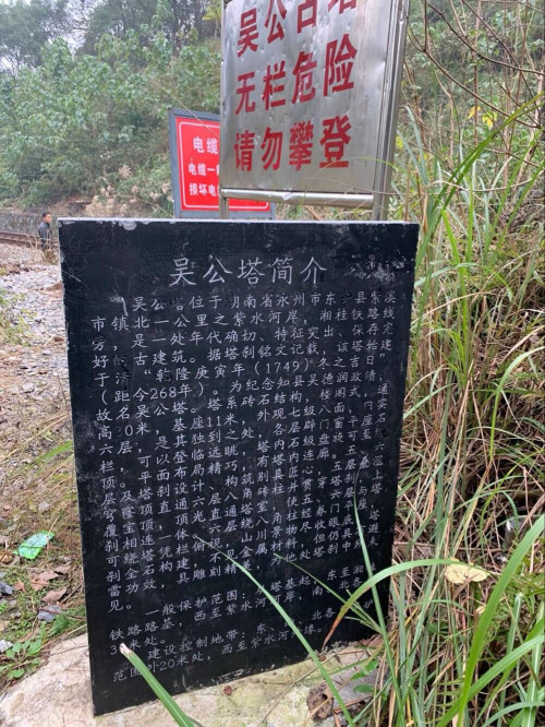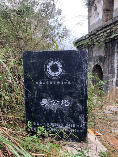 紫溪市是老县城附属城镇,自宋雍熙元年(984)至民国36年(1947),县城都在紫溪。清乾隆十四年(1749)冬,时任东安知县吴德润主持,在县城边建造这座塔。起初取名叫“回隆塔”,希望此塔能开启一方文运,“回涧紫水文光射”,主要是起教化作用的,与佛教无关。不料塔还没建好,这位为官清廉、善断讼事的人民好县长吴公就调走了,建塔工程停了下来。续任县令荆道乾是个为政为人都很正直的厚道人,接着建这转风水、得民心的塔。历时三年,于乾隆十七年(1752)竣工。荆道乾并未贪天功为己有,为纪念前任县长的功绩,把这塔命名为“吴公塔”