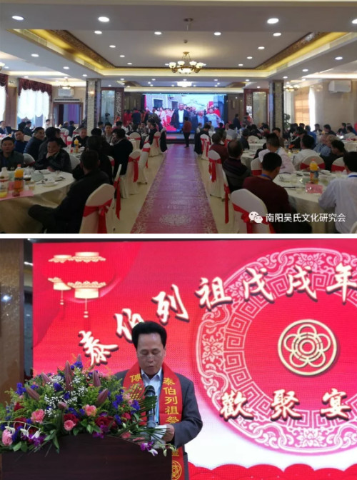 祭祀典礼后,参加活动的宗亲又共同参加了"泰伯列祖戊戌年祭祀典礼欢聚宴会”。会上,吴辉会长首先致词,他说: “祭祀先祖的意义就是教导人们不忘根本,树立忠孝诚信思想,学会感恩,养成爱人如己的品行,更好地弘扬泰伯三让天下的至德精神,世世代代把好的家风传承下去。”