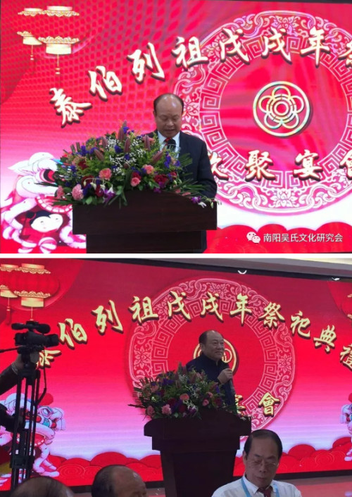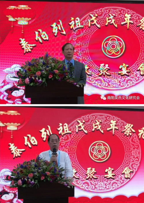 参加典礼活动的嘉宾代表澳门吴氏宗亲总会会长、世界不动产联盟中国澳门分会创会会长吴利勋、大潮汕吴氏宗亲总会会长吴汉龙、两陆吴文化交流中心会会长吴远林及南阳吴氏文化研究会会长吴雷分别发言致词。