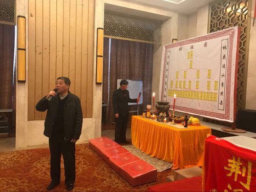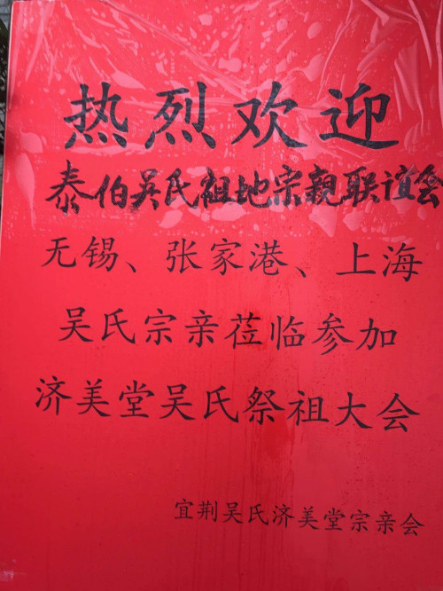 宜兴南岳山庄宾馆会议厅内正中悬挂“宜荆吴氏济美堂宗亲祭祖会”横幅。右侧正中悬挂宜兴拜祖图:一世祖德明公夫妇等祖先神位:两边竖写桃花流水杳然去、留得和风惠子孙;供品琳琅满目;气氛庄重热烈;神情肃穆神圣;香火氤氲,宗亲们按序焚香祭拜、敬献花果珍馐。吴氏族人怀着崇敬之情向祖先上香、跪拜先祖,保佑家家户户人人身体健康。出入平安!人财两旺!福泽绵长!