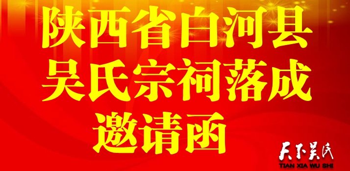 承蒙各地宗亲当地知名人士及竹白吴氏宗亲的鼎力支持,修建陕西省白河吴氏大宗祠历经两年修建已基本完工此功德无量将刻碑留芳。正所谓天下吴氏一家亲,为了弘扬家族文化促进宗亲和谐交流,增强宗亲的团结互助,共同庆祝我族这一盛事,经宗亲领导商议择吉日于公元2019年元月30号(农历腊月25日)星期三上午10点在祠堂隆重举行。