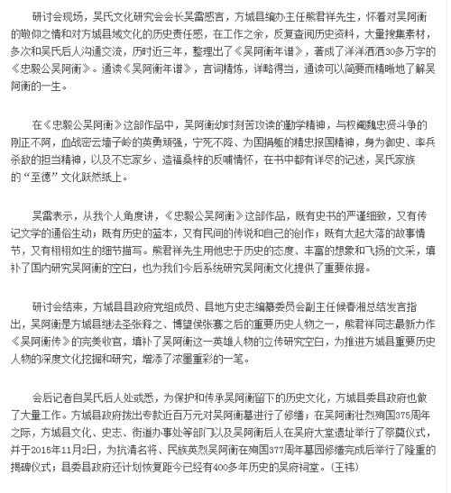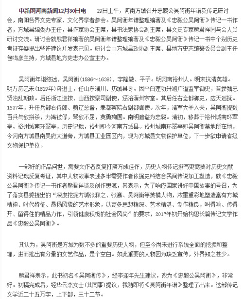 河南方城召开“忠毅公吴阿衡”年谱暨传记研讨会