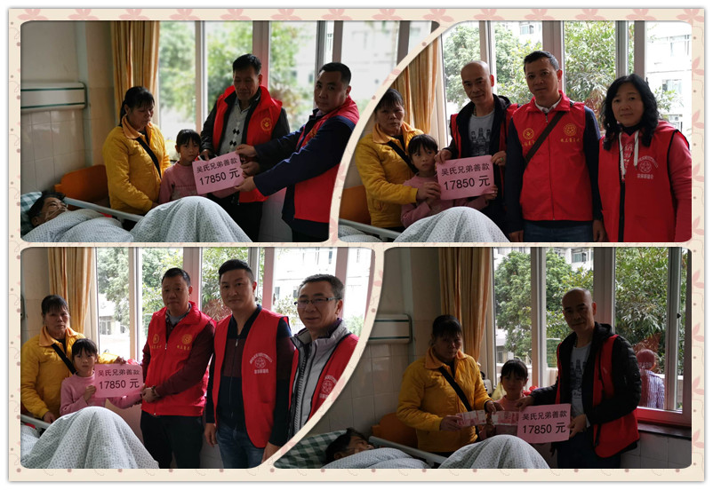 江门市东红村三组低保户吴超波兄弟于2018年12月26号早上突然晕在地上,经送往五邑中医院检查后进入NICU重症房,急需要资金帮助;江门礼乐吴氏(竹野公)宗亲联谊会获知情况后,立即召开各会长和理事会会议,同意从联谊会基金中资助1000元给低保户吴超波宗亲;中山市吴氏竹野公联谊会知道情况后也捐款1000元给低保户吴超波宗亲;在江门礼乐吴氏(竹野公)宗亲联谊会、广东珠三角吴氏宗亲会、泰伯基金会、中山市吴氏竹野公联谊会主要领导吴镇添、吴占标、吴志刚、吴昌禄、吴国标等宗长的牵头下,在广东珠三角吴氏宗亲会常务副会长吴镇添、吴占标的亲自组织发动下,宗亲们伸出爱心之手,纷纷捐款,几天时间就捐款17850元。(撰稿吴昌禄)