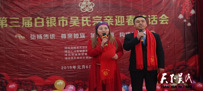 2019年1月6日这一天是农历戊戌年腊月初一,位于西北黄土高原黄河之边,具有悠久历史的甘肃靖远县城,寒风凛冽,阳光明媚。第三届白银市吴氏宗亲迎春茶话会在靖远县城乌兰宾馆隆重举行。大会会场绚丽多彩,喜庆祥和,与会宗亲精神饱满、情意浓浓。会议由靖远宗亲吴承祖、吴玉淑联合主持。上午9时30分,主持人以激情昂扬的开首语正式拉开会议序幕,并在庄重的《国歌》声和悠扬的《吴氏颂歌》中隆重开幕。首先,为表达对历代吴氏先祖的敬仰之情,与会宗亲向历代吴氏先祖行默念礼!随后,本次会议筹备工作组副组长、承办会议宗亲代表吴华致欢迎辞。会上,白银市吴氏文化研究会(筹)会长,本次会议筹备工作组组长吴有忠做主题讲话;白银市吴氏文化研究会(筹)副会长、景泰县吴氏宗亲会会长吴守存,甘肃条城吴氏家族宗亲会副会长吴文贵和会议赞助单位甘肃滨河酒业销售有限公司经理陈涛分别向大会致辞。为达到宗亲交流,共话吴氏事业,会上参会各地宗亲代表吴守春、吴玉君、吴正态、吴国新、吴秀娟、吴曜辰、吴映璋等宗亲围绕弘扬传承吴氏文化、开展宗谊交流、回顾家族历史、弘扬祖德、践行孝道等问题进行交流发言,大家谈认识、谈体会、共话吴氏未来发展大计。大家一致认为,组织开展白银市吴氏宗亲联谊活动,大力弘扬和践行以吴氏文化为主要内容的优秀传统文化,是振兴吴氏文化发展、推动社会文明进步的现实需要,是适应新时代社会发展潮流的需要。一致表示,要以“不以物喜,不以己悲”和“勿以小善而不为,勿以无利而不做”的思想境界,积极参与宗亲活动,加强对吴氏历史文化的学习和研究,增强践行优良传统主动意识。大家倡导与会宗亲要始终以胸怀感恩的向善心态,关心吴氏事业,注重良好家风传统的营造,积极参与和支持白银市吴氏文化研究会工作,共同为弘扬吴氏文化、传承至德精神尽心出力,做出自己的贡献。