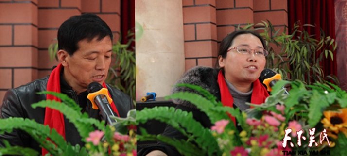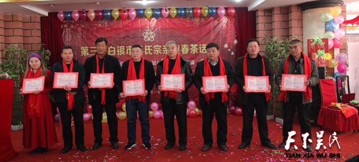 会上,白银市吴氏文化研究会对近年来关心支持吴氏事业,为吴氏事业奉献爱心、尽心出力,积极承办历届迎春茶话会,做出突出贡献的宗亲进行了表彰。白银市吴氏文化研究会副秘书长吴克田宣读《白银市吴氏文化研究会关于对吴大远等10名宗亲给予表彰的决定》。白银市吴氏文化研究会会长吴有忠向受表彰的景泰县宗亲吴大远、吴守存、吴守东;白银区宗亲吴鹏强、吴文和、吴文新;靖远县宗亲吴冠金、吴玉淑、吴育荣、吴雪颁发荣誉证书。与此同时,会上与会宗亲向倡导带领白银吴氏弘扬传承吴氏文化、开展宗谊交流的吴有忠会长和保护先祖历史文物的靖远东湾宗亲吴振玉老人进行披红鼓励,对他们为吴氏事业所做的贡献给予充分肯定。部分宗亲还以赠送展示吴氏文化精神的书法作品,向《第三届白银市吴氏宗亲迎春茶话会》的胜利召开表示祝贺。