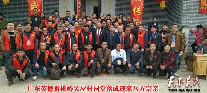 天下吴氏讯(吴蜀丰广东英德报道 特约采编 吴文彬 吴国梁)【编者按】家风传承树典范,吴屋祠堂闹声欢,锣鼓喧天鞭炮响,至德精神万代传。今日(2019年1月12日)来自香港福建省江西及广东省境内的八千多名吴氏宗亲应邀出席参加广东省英德市九龙河头番桃岭吴屋村祠堂落成庆典。