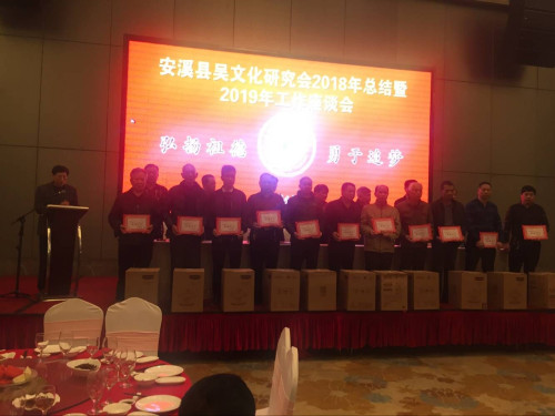 二是参加12月底省吴氏委员会年会及《福建姓氏志——吴氏》《中华吴文化大典》编纂交流活动。我县响应省吴氏委员会去年布置的任务,于2018年9月份之前,按时上交《福建省姓氏志——吴氏(安溪篇)》的送审稿,共200多页,并获得省吴氏委员会的肯定,吴建霖秘书长获邀在2018年底省会举办的会议上进行报告交流。安溪县吴文化研究会在会上获得2018年“先进集体”表彰。