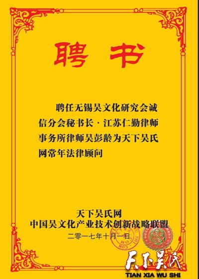 常年法律顾问吴彭龄 执业证号码:13202199210937510 江苏仁勤律师事务所