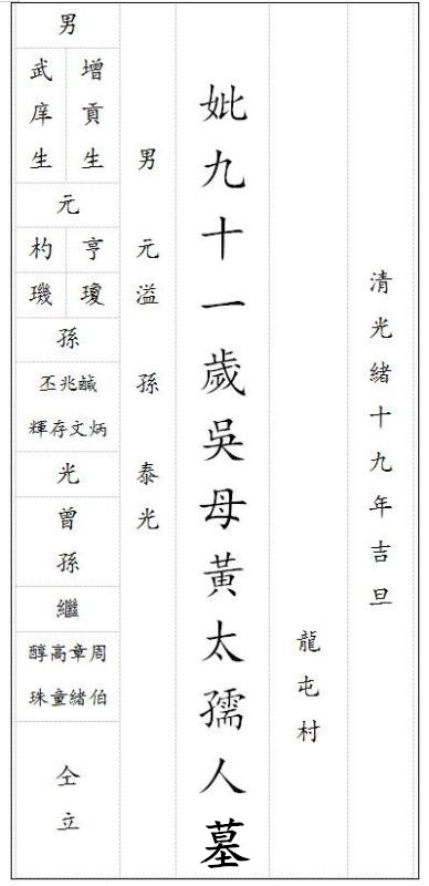 【龙屯17世】(1)吴泰光,原名其泰,字成章,元益子,娶翁氏,无子,候元亨孙嗣。(2)吴兆光,元亨长子,字仕阶,业儒,娶杨氏,无子,女适那四武生王定燕子,兆葬后东。(3)吴文光,元亨次子,字焕南,业儒,娶柯氏,氏葬茅园。(4)吴存光,元亨三子,字诚美,童试备取,业儒,男继周,女一。(5)吴咸光,元杓长子,字一山,娶欧阳氏,继娶温氏,男继章,女二。(6)吴炳光,元琼长子,字彪如,娶朗涡黄氏,男继高,女二。(7)吴丕光,元玑长子,字谟臣,娶周氏,男四,继醇、继童、继珠、继伯。(8)吴辉光,元玑次子,字玉生,业儒,娶陈氏,女一,男一继绪。