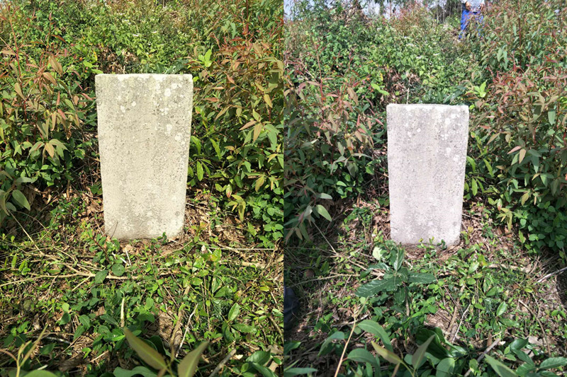 为了查清碑文,中午我们回到龙塘镇,拟买些宣纸铺盖辨认。午饭后,找不到宣纸,我们买了些祭品,再次到墓地查看碑文。下午的阳光明媚,上午看不清的字迹,有些已可以辨认,借着光线,我们横看竖看,上瞄下瞧,依稀辨出左边有“男,贡,武,孙,丕、炳,曾孙,周”等字,左边中间字有“男,溢,孙,泰”等字。由于没有携带族谱,一时间也想不到是哪房哪代的子孙,只能留待回家再查考。看看已经是下午四点多了,我们祭拜祖坟,就返回村了。