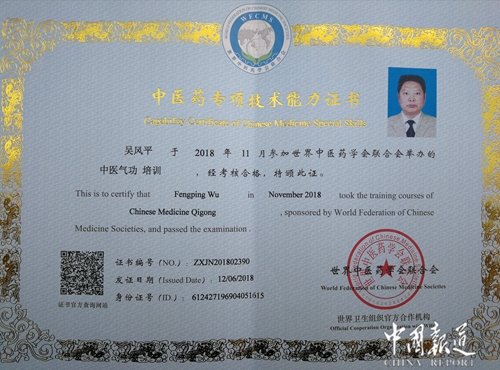 中国报道讯(吴蜀丰报道)近日,北京至德圣道中医药研究院院长吴风平风平教授取得国家体育总局社会体育指导中心健身气功教练一级资格证书。